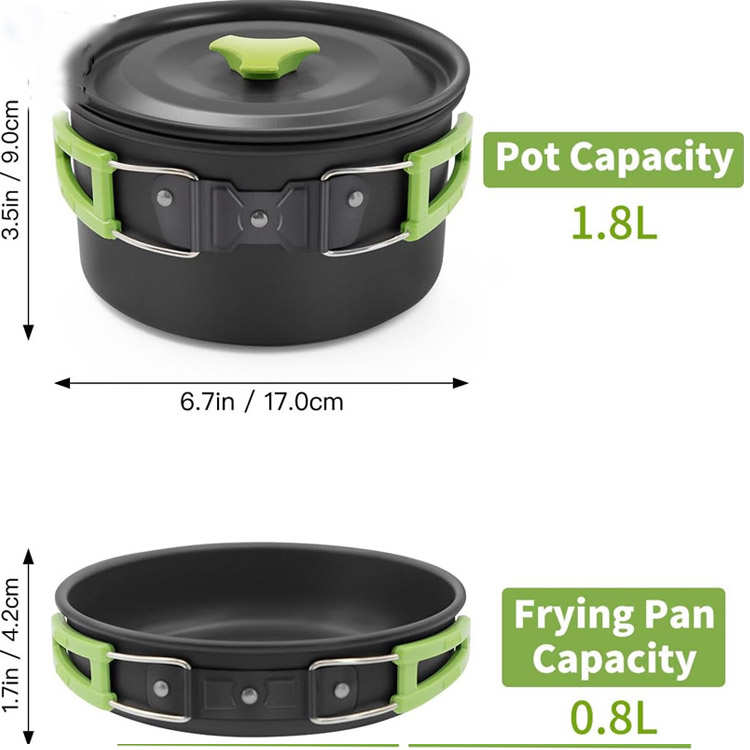 Овај свеобухватни комплет укључује све што је потребно за оброке на отвореном: лонце, тигање, шоље, тањире, виљушке, ножеве и кашике - пружајући комплетно кухињско решење за авантуре на камповању.