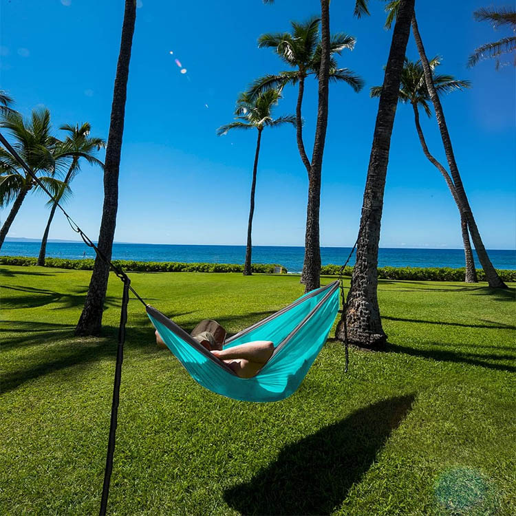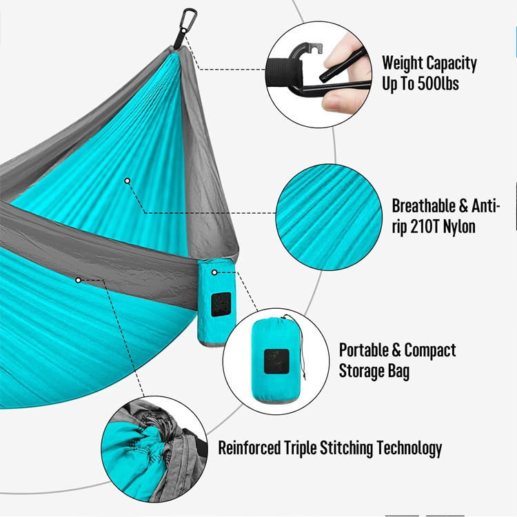 Висећа мрежа за камповање Двострука и једнострука преносива висећа мрежа. Ваш врхунски свестрани систем за опуштање за авантуре на отвореном. Ова висећа мрежа за камповање може да прими и двокреветне и појединачне кориснике са својим прилагодљивим дизајном. У комплету са професионалним тракама за дрво, ова лагана најлонска падобранска висећа мрежа пружа максималну удобност и преносивост.