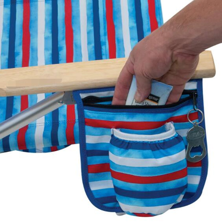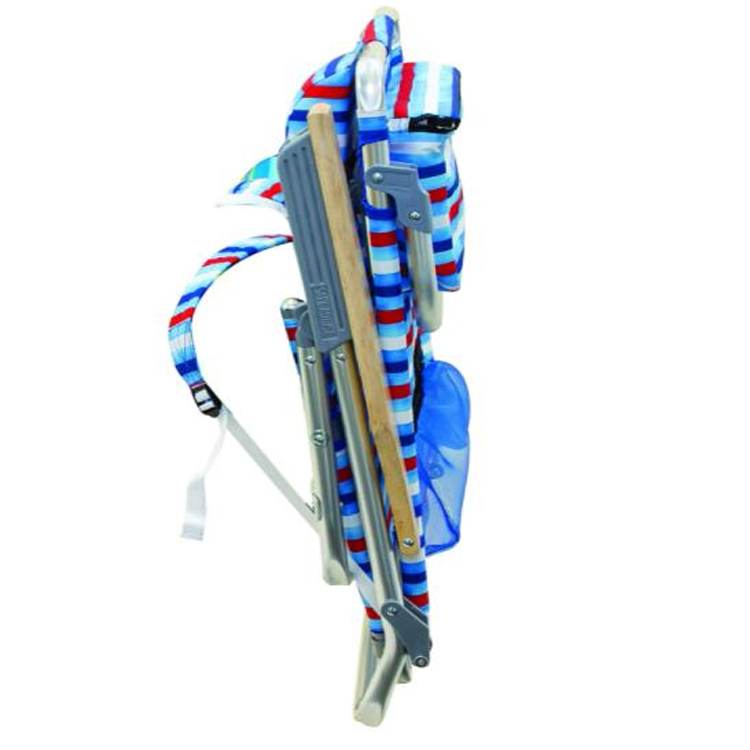 Класична вањска столица за плажу у стилу руксака са равним преклопом. Компактан, лаган вањски намјештај са пругастим дизајном. Израђен од луксузног металног алуминијума за трајну удобност. Идеално за излете на плажу и пикнике. Доступан у класичној црвеној, белој и плавој боји.