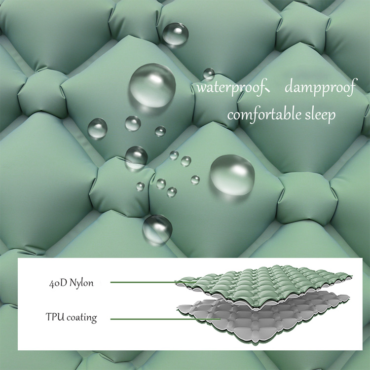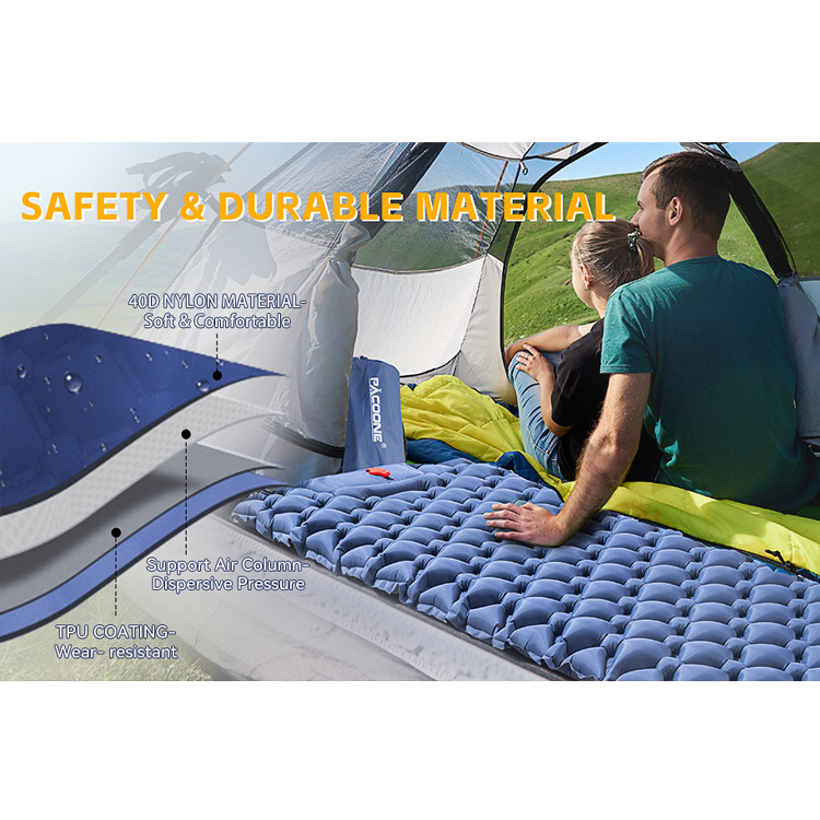 Лагани најлонски материјал Склопиви шатор за камповање Подлога за спавање. Ваше врхунско преносиво решење за спавање за авантуре на отвореном. Овај ултралаки душек на надувавање има надувавање једним притиском и интегрисани дизајн јастука. Направљен од издржљивог најлонског материјала, пружа врхунску удобност за планинарење и камповање, осигуравајући мирне ноћи било где.