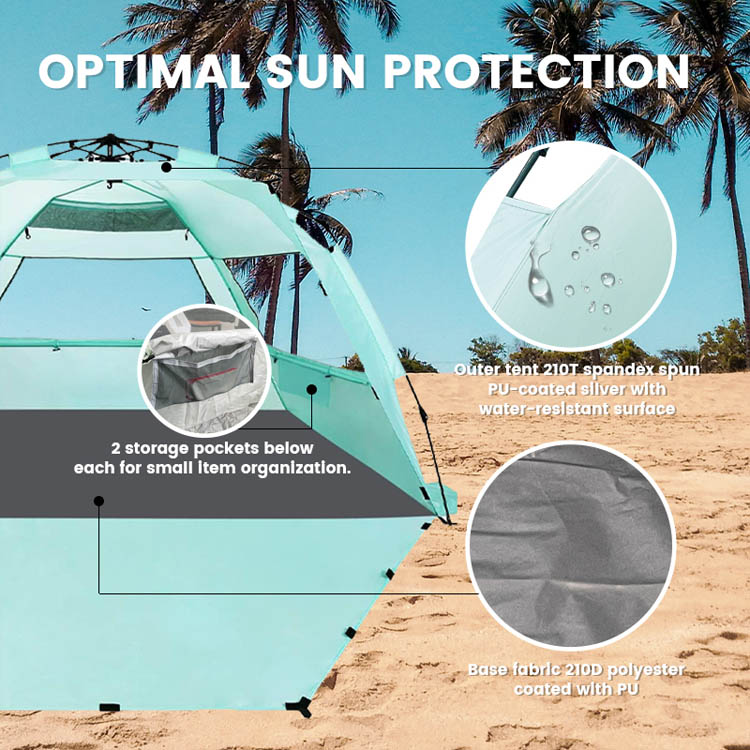 Специјализована тканина пресвучена сребром блокира 98% штетних УВ зрака, истовремено одржавајући одличан проток ваздуха, стварајући хладну засјењену област за дужи боравак на плажи.